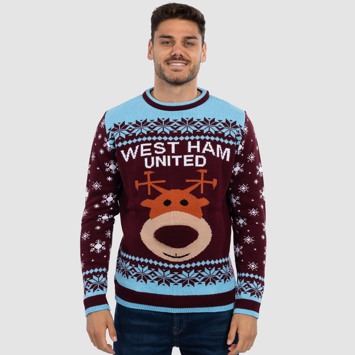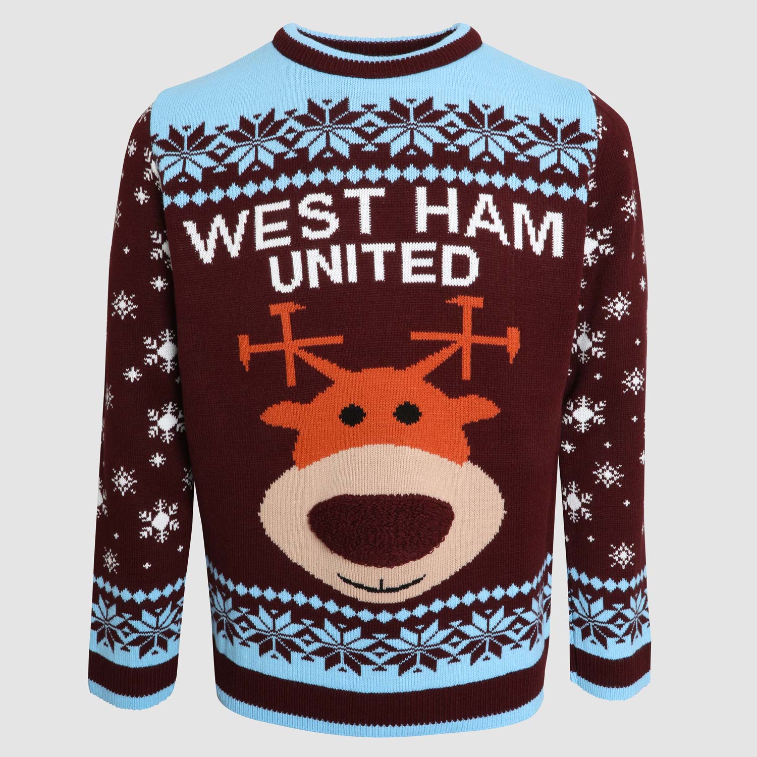 Bring some festive fun to your winter wardrobe with this cosy West Ham United Reindeer Christmas Jumper! Featuring a bold ""West Ham United"" print and a large reindeer graphic front and centre, it’s the perfect blend of holiday spirit and claret and blue pride.