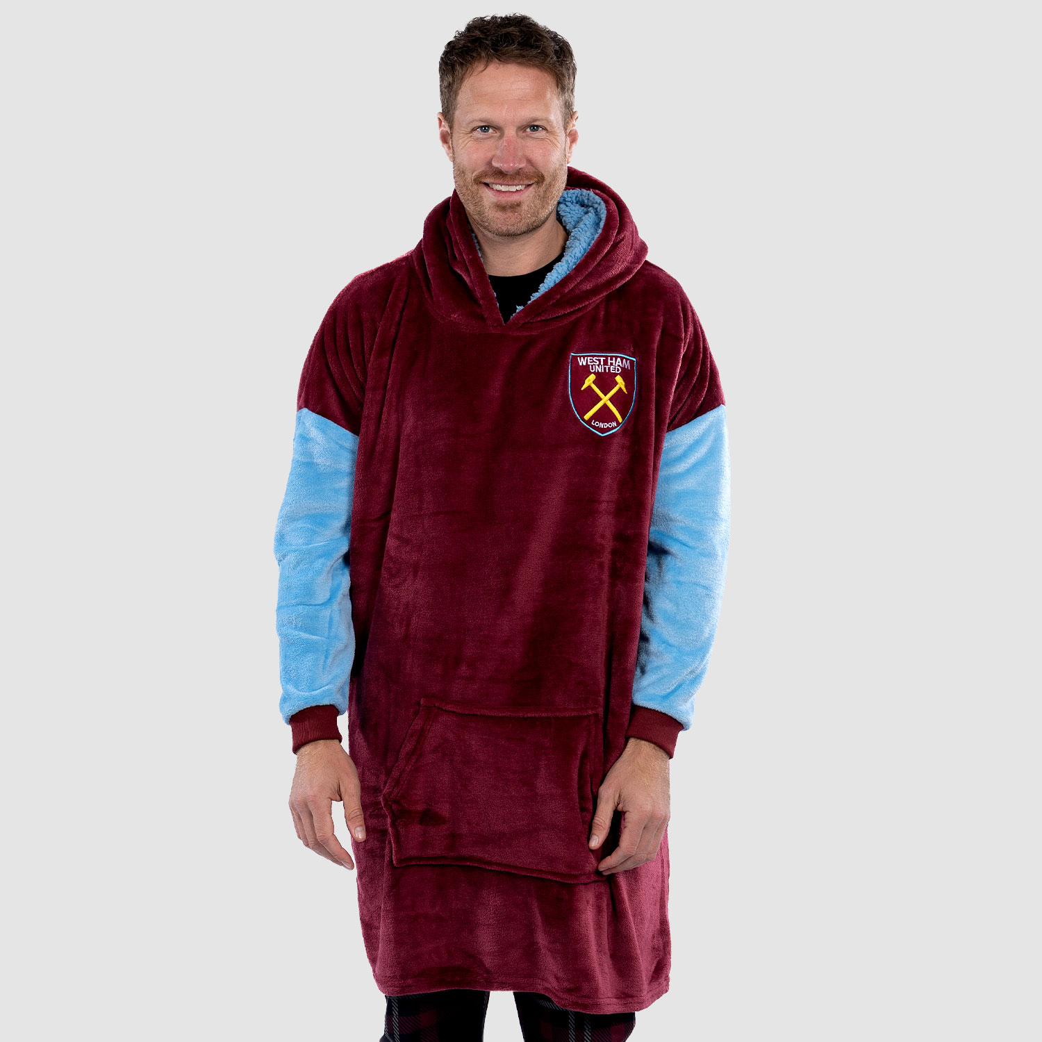 Stay warm and show your team pride with the official West Ham United Juniors Fleece Poncho. Designed in classic claret with contrasting sky blue sleeves and a soft sky blue lining inside the hood, this poncho combines comfort with club spirit.
