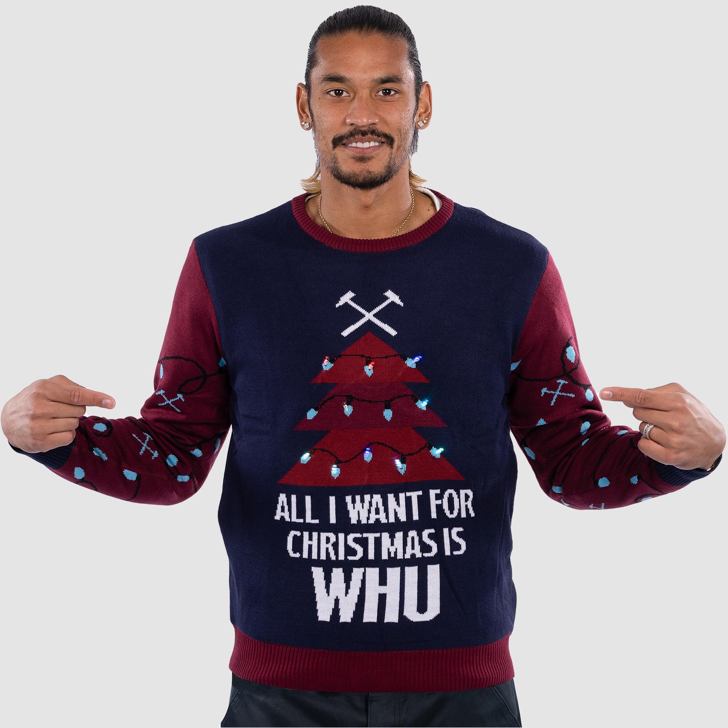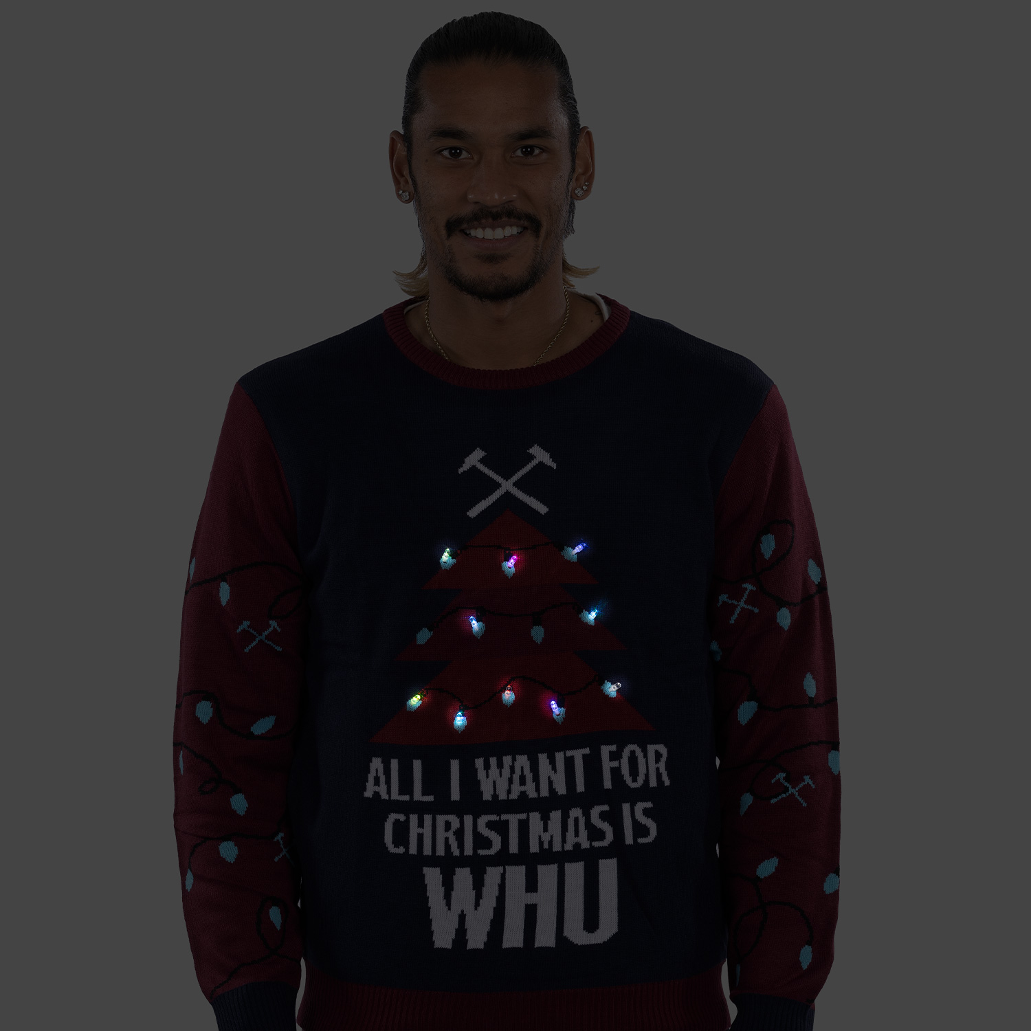 Shine bright this festive season with our Light-Up Christmas Jumper, featuring the fun and festive slogan: “All I Want for Christmas is WHU.” Designed for true Hammers fans, this jumper doesn’t just show your love for the club – it lights it up!
